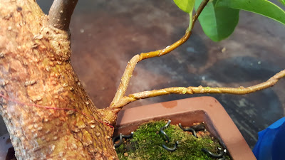 Oh, by the way. This ficus was an epiphyte the grounds keepers hacked last year. When I collected it, it had no branches or leaves. Now it has amazing huge leaves and it is developing branches. I just noticed from the picture above that it is time to remove the dead wood and give it a nice smooth and tapered look. Cheers.